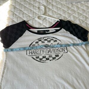 Classic Harley-Davidson raglan with bold logo. Black sleeves and white body. Racing flag! Pit to