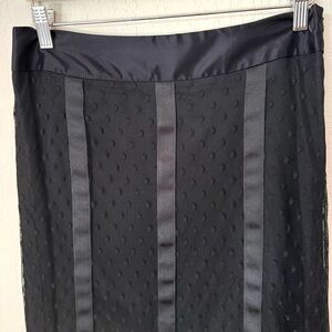 Size 8. Like new - no signs of wear. Made in USA - vintage paper tag. Beautiful black evening pencil skirt. Knee length. 2 layers - black lining with Swiss dotted tulle & grosgrain ribbon overlay. Invisible zipper on side. No pockets. Shown modeled on a size 0 mannequin with extra fabric cinched in back - fit may differ. Approximate measurements (taken when laying flat - cannot guarantee fit):
