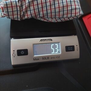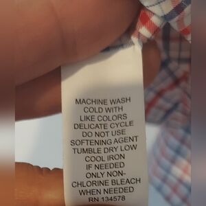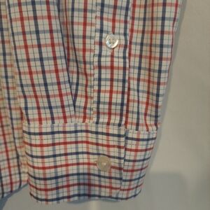 This shirt is in excellent preowned condition. It is NOT made of cotton so it isn't stiff like I've noticed a lot of men's dress shirts are. This is by far the softest men's dress shirt I think I've ever felt. It is 57% nylon and 43% polyester. Nice check pattern too. Chest measures at 45in. Size large.