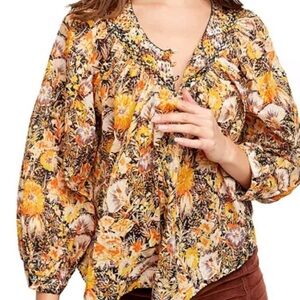 Chic floral blouse with a V-neck design. Features a vibrant mix of colors. Ideal for casual outings.