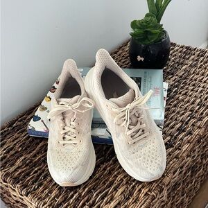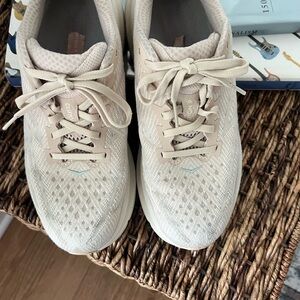 Comfortable Hoka shoes in a cream shade. Ideal for active wear.