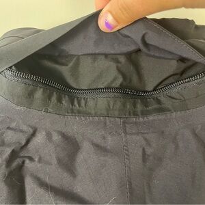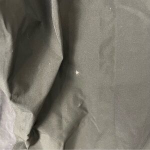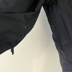 This jacket is in fair condition. small hole in arm, slight white stains by pockets, small stains on back. missing detachable hood as seen by the zipper on collar, but still wearable. zippered pockets, velcro and zipper closure. double zipper, shell = polyester, lining = nylon.