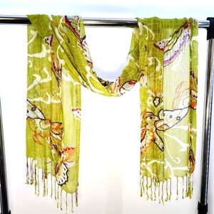 This scarf is vibrant and artistic, showcasing a light green background adorned with abstract floral and butterfly motifs. The illustrations are dynamic and colorful, with accents of orange, purple, white, black, and hints of peach, giving the scarf a lively and expressive nature. The large-scale patterns are painterly, almost like watercolor or batik-style designs, with soft edges and flowing lines.