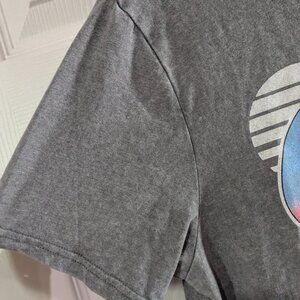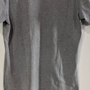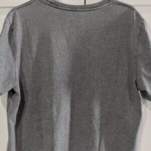 Corvette Chemistry men's gray short sleeve graphic t-shirt in size medium, featuring a Corvette logo and convertible Corvette car print on the front. Made from a soft cotton/polyester blend with a classic crew neck. Officially licensed by GM and machine washable. Pre-owned in excellent condition. Measures approximately 20.5" armpit to armpit, 26.5" from center back of neck to hem, and 8" sleeve length from shoulder seam.