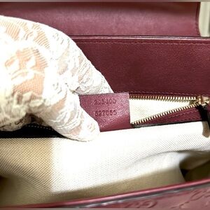 Sophisticated Gucci shoulder bag in deep red. Features embossed logo pattern and elegant chain straps. Perfect for stylish outings.