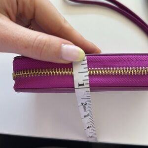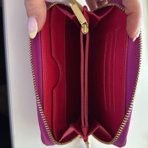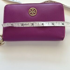 The Tory Burch Purple Dena Leather Zip Continental Clutch Wallet is a chic accessory that combines elegance with practicality. Crafted from smooth leather, it features a striking gold-tone logo medallion and a convenient wrist strap. This standout piece is perfect for adding a pop of color to any ensemble.