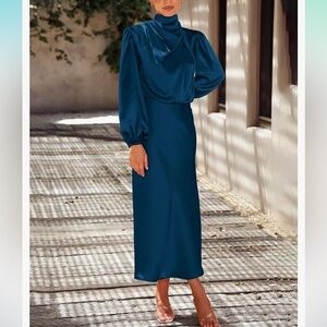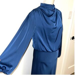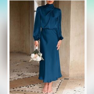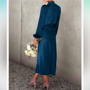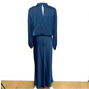 New, with tags, this gorgeous teal blue satin midi dress has a blouson waist with long puff sleeves and elastic at the wrists. So flattering on! Buttons at neckline in back. Sadly, needed a different size and waited too late to return.