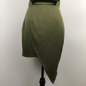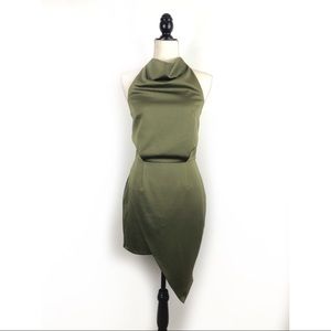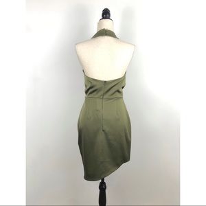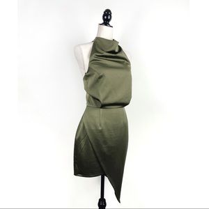 Elegant olive green dress by Elliatt. Features a draped halter neckline. Asymmetrical hem adds a modern touch. Perfect for evening wear.