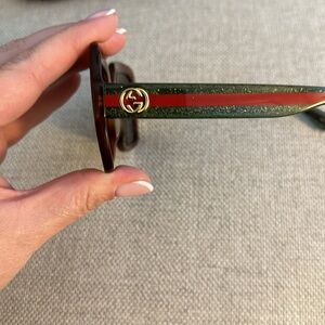 Stylish Gucci sunglasses. Brown frame with green lenses. Comes with a purple case.