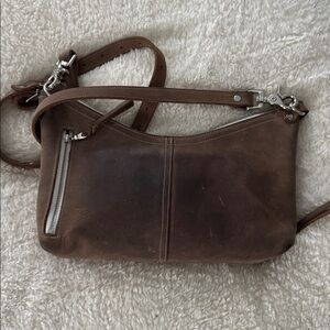 Stylish brown leather crossbody bag perfect for everyday use. Features a sleek design with a convenient front zipper pocket.