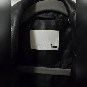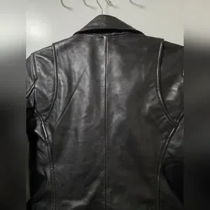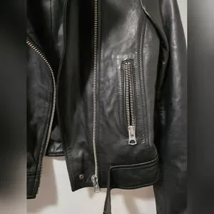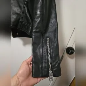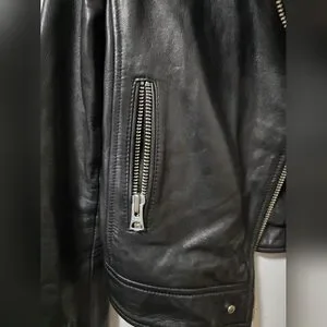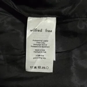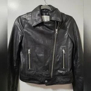 Sleek black leather jacket by Wilfred. Features zippered pockets and classic design. Perfect for a stylish look.in very good condition I accept offers