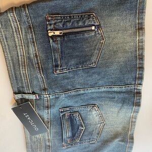 Elevate your style with the Outcast Carlotta Blue Denim Mini Skirt. Perfect for casual outings, this skirt features a classic blue hue and stylish zipper details. Pair it with your favorite top for a chic look.