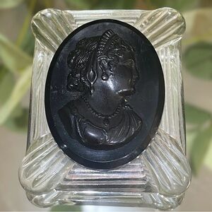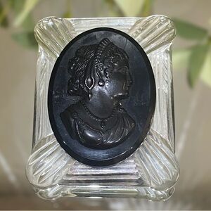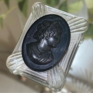 This is a vintage cameo brooch. Clear lucite and a black Victorian lady cameo. Cameo could be Bakelite but not tested. Old clasp system pre spring tab. Measures 1.75” x 2.25”. Beautiful brooch.