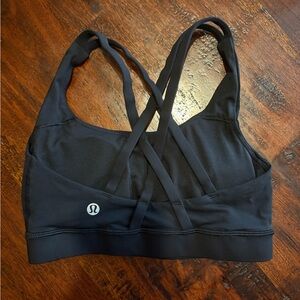 Stylish black sports bra with crisscross straps. Ideal for active wear.
