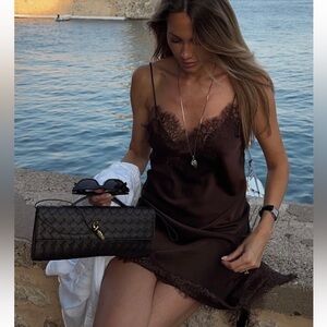 Satin V-neck dress with thin straps. Lace appliqué detail. Asymmetric hem with vent.