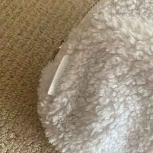 Stylish cream sherpa belt bag by Lululemon. Features a secure zip closure. Ideal for essentials.
