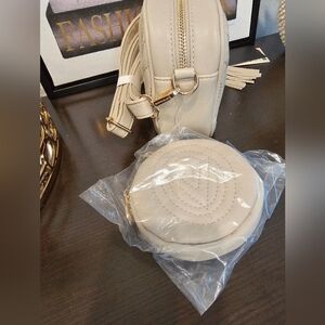 new with tags Valentino Orlandi Taupe shoulder bag with extra pouch. This elegant cream quilted crossbody bag is perfect for any occasion. Its stylish design and versatile color make it a must-have accessory.