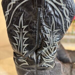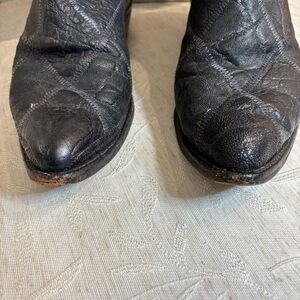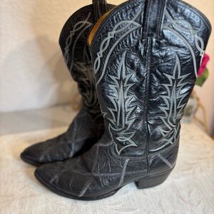 The Tony Lama Vintage Western Boots in black with a snake lizard patchwork design are a stylish and unique addition to any man's footwear collection. These size 10D boots feature a pointed toe shape, pull-on closure, and leather lining and upper material. With a cowboy theme and western style, these lightweight boots are perfect for those looking to make a statement with their footwear.