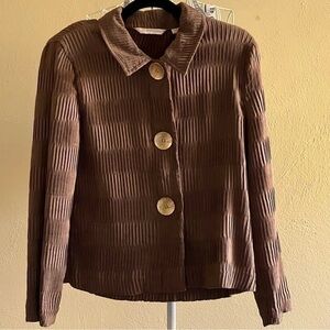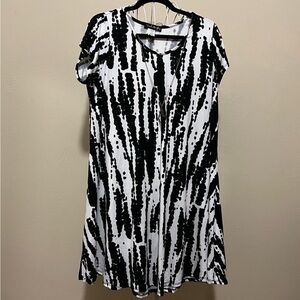 Chic dress with striking black and tan pattern. Made from recycled polyester. Invisible side zipper. No materials tag.