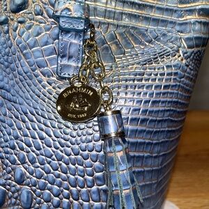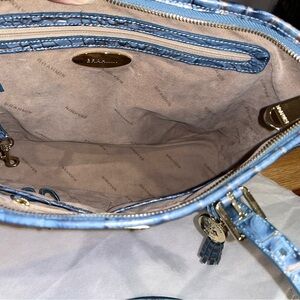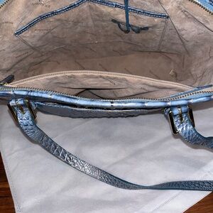 This stylish blue crocodile-embossed Brahmin bag has been slightly used but overall is in great condition. The inside of the bag is suede. Does not have the registration card or dust bag.