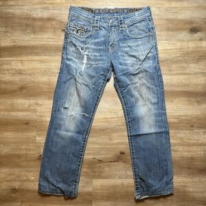 Rock Revival Jeans Mens 33 Richie Straight Leg Thrashed Rockstar Repaired Denim
