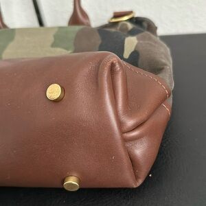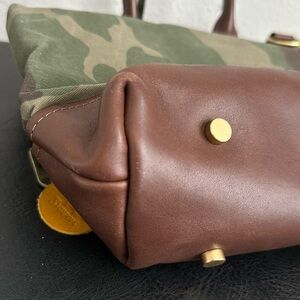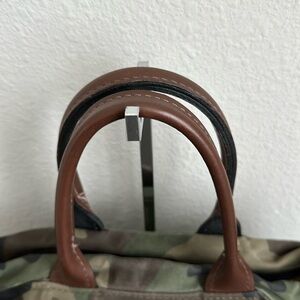Stylish camouflage tote bag featuring rich brown accents. Perfect for everyday use with a chic and functional design.