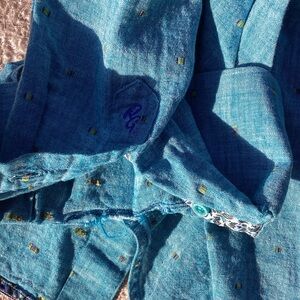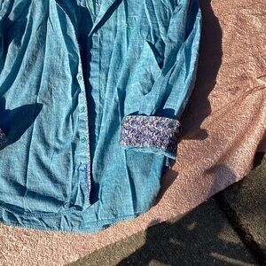 Vibrant teal shirt with distinctive patterned collar and cuffs. Ideal for versatile styling.