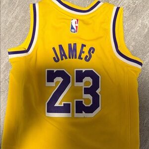 Vibrant gold Lakers jersey by Nike. Features iconic team logo and number. Ideal for young sports fans.