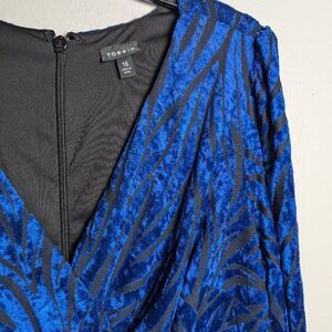 Elevate your evening look with this Torrid dress, featuring a striking cobalt blue hue abstract zebra print and a sophisticated faux wrap design. The long bishop sleeves and v-neckline add a touch of elegance, while the tie front detail accentuates your waist. Perfect for a cocktail night out, this bodycon dress ensures you make a memorable entrance. Sheer Burnout stretch velvet over a black inside lining. Back zip. Measures 38" long, 22" flat across the bust, 20" flat across the waist and 25" flat across the hips