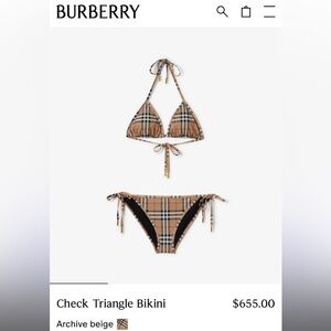 Stylish Burberry bikini with classic plaid design. Features side ties for a custom fit.