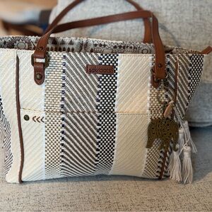 Chic tote with iconic MK pattern. Dual handles for easy carrying. Perfect for daily essentials. Inside zip and pouches for phone. Only two tiny callouts as shown in pictures (spot stain and threads at base of strap)