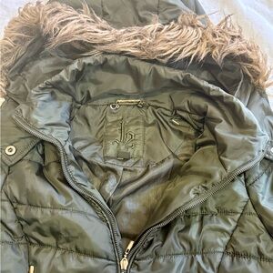 Stay cozy and stylish in this dark olive green J2 puffer jacket, perfect for cold weather. This junior size XS bomber-style winter coat features a faux fur-lined hood, ribbed knit cuffs and waistband, and gold-tone zipper details. Please note the inner lining has a tear (pictured) but the exterior remains in good condition. This trendy coat works well for casual, streetwear, or utility-inspired outfits.