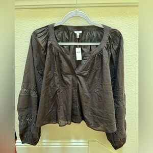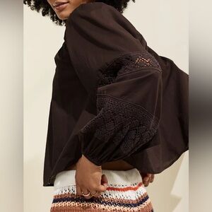 This boho brown top features crochet detailing on the sleeves, offering a sophisticated look for any occasion. Perfect for pairing with your favorite jeans or a stylish skirt.