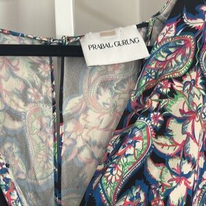 Bright and playful paisley lights up this Prabal Gurung silk dress styled with a twisted v-neck and covered buttons.