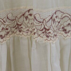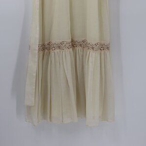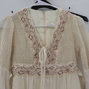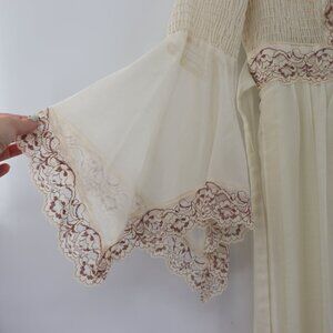 This dress is STUNNING. it is a size 7, 100% polyester. It's in great shape, but there is a small hole in the front. It has a tie at the bust and flowy sleeves. It is 15" p2p 13" waist 57" length