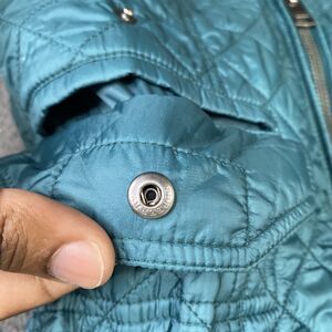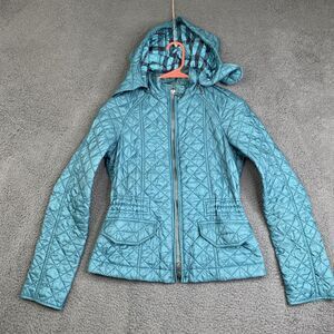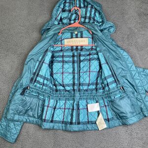 Burberry Brit Jacket Womens Small Teal Quilted Hooded Nylon Full Zip Plaid Lined