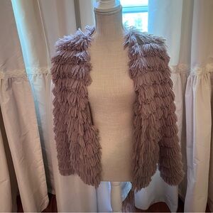 She + Sky size small soft faux fringe fur taupe jacket. Used but good condition has a clasp at the top collar area for closure and another midway down front.
