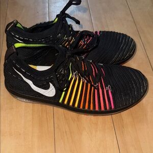 Nike sneakers featuring a black knit design. Accented with bright orange, pink, and green stripes. Sleek and modern look. Nike running shoes, VGUC - shows some signs of wear.