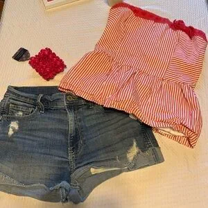 Hollister all the way! Chic hollister pink and white striped crop top, ruffle bottom, fits like a medium, has stretch in back. Paired with hollister denim shorts.Perfect for summer vibes. Comfortable and stylish. Included paparazzi pink boho wooden bracelet.