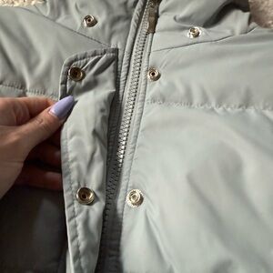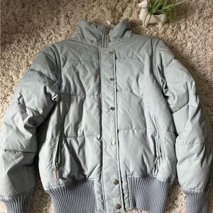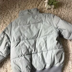 Stylish light gray puffer jacket with ribbed cuffs and hem. Features a high collar and snap button closure.