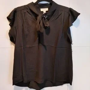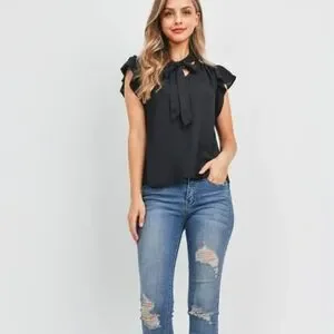 Ruffle Sleeve Blouse in Black. NWT boutique item. Multiple sizing options available. Approximate measurement: L: 24" B: 36" W: 38". 100% polyester. Short flutter sleeves, pleated details at neckline, v-neck, adjustable tie detail around the neck. It is such a fun and flirty blouse.