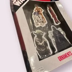 Set of Star Wars character ornaments. Features iconic figures in detailed designs. Box is 5.5" x 7"