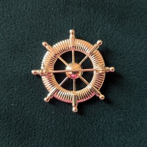 Gold-tone ship's wheel brooch with various-sized rhinestones. Approx. 1.25" in diameter. In excellent condition. Perfect for any occasion.
