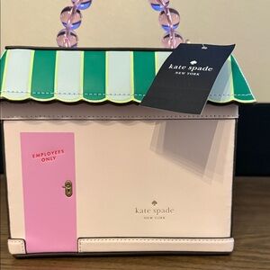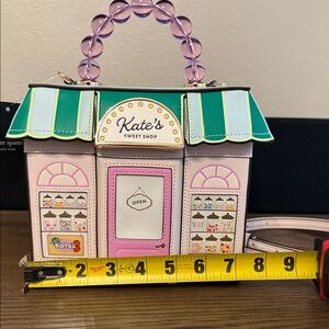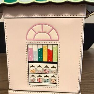 Charming handbag shaped like a sweet shop. Features pink, green, and white colors. Unique beaded handle.limited bag no longer in stores