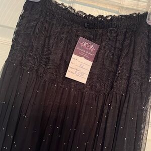 NWT Dress like an Angle, black with white dots and floral print. Very pretty. Tag has Xl but definitely fits more like a small. Waist 24” unstretched. It’s lined but you will still need to wear a slip.
