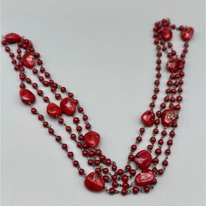Make a bold statement with this stunning vintage beaded necklace, featuring vibrant red glass beads in both smooth round and chunky freeform shapes. The larger beads have a unique, handmade appearance—some adorned with colorful millefiori-style details, suggesting possible Murano glass origins. The strand is accented with antiqued gold-tone wire links that give it a lovely vintage charm. Measuring approximately 50 inches long, this necklace can be worn long or doubled for a layered look. A striking and versatile piece perfect for collectors or lovers of vintage glass jewelry.