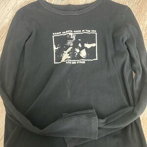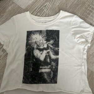 Stylish crop top with Yellowstone graphic. Features brown sleeves and cream body. Perfect for casual wear.