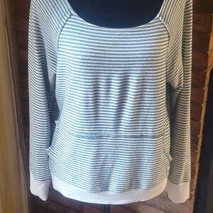 Casual, open neck lightweight sweater with sweatshirt vibes. Front pouch pocket. Neck style worn over both shoulders or off one shoulder. Good condition.