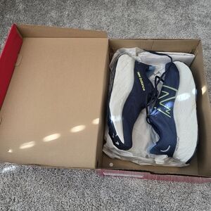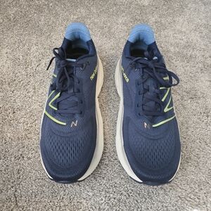 Navy New Balance sneakers with Fresh Foam cushioning. Lime accents for a vibrant touch.