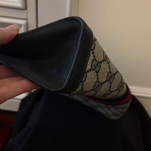 Stylish Gucci clutch with iconic pattern. Features bold red and black stripe. Perfect for modern elegance.
